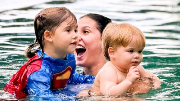 Super divertida, Ana brincou com as pequenas, que mostraram os resultados das aulas de natação que começaram logo nos primeiros anos de vida. Enquanto Maria Flor usou um maiô rosa com desenhos infantis, Maria Alice apareceu usando uma fantasia de super-herói, o que já virou assunto nas redes sociais de Virgínia.