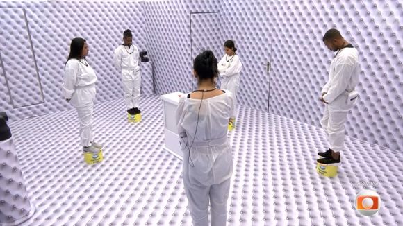 Durante a edição do 'BBB 26' deste sábado (17), dois Dummies invadiram o Quarto Branco e colocaram 5 mini plataformas redondas ao redor do botão central, onde, imediatamente, a voz do Big Boss ordenou que cada participante subisse em cima de uma delas.