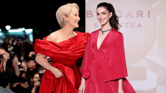 Miranda Priestly se aposentou? Anne Hathaway encarna o 'Diabo' em look vermelho-sangue da Valentino, e colar Bvlgari de safira com mais de 26 quilates rouba a cena